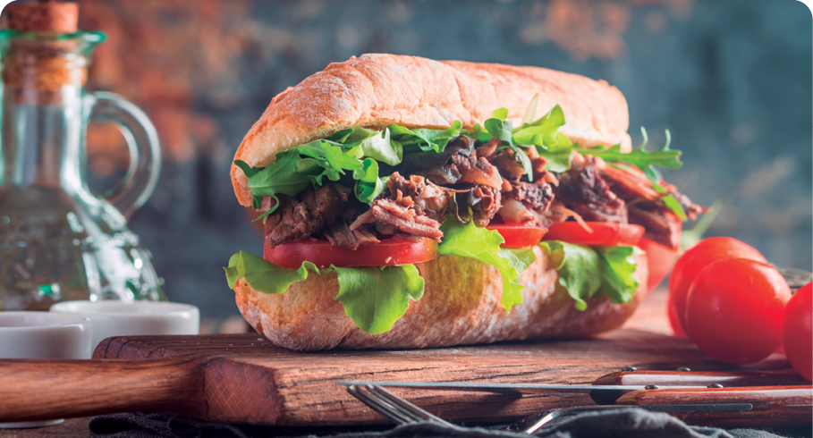 - En el último momento, abre la bolsa del codillo y retira la carne del hueso, rompiéndola con los dedos. Repártela sobre los bollos abiertos, a continuación, añade la picada de vegetales y encima de todo, el queso. Pasa por el grill unos minutos para fundir el queso y sirve de inmediato.