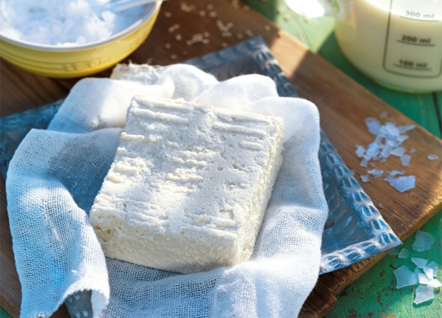 4. Colocar la gasa en el interior del molde para tofu y verter sobre ella la cuajada, colocar la tapa, presionar un poco y dejar cuajar de 15 a 20 minutos. Luego se puede cortar en porciones más pequeñas y conservar en agua en la nevera.