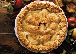 2. Forre el fondo de un molde para tartas (de borde bajo y de 20-22 cm de diámetro) con una lámina de pasta brisa y coloque las manzanas rebozadas. Trocee la mantequilla fría en láminas finas y distribúyalas encima de la manzana. Una vez hecho esto, tape con otro disco de pasta brisa, cerrando bien el perímetro. Recorte un agujero en el centro de unos 3 cm de diámetro.