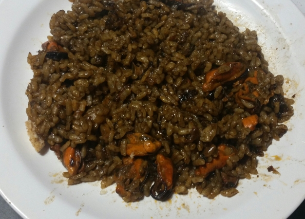 - Echar los calamares (en su tinta), remover; el arroz,remover; y el caldo de pescado ya caliente.