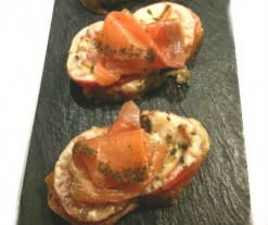 - Disponga el tomate y la mozzarella en rodajas encima de las rebanadas.