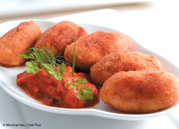 - Vierta el aceite de girasol en la cubeta y programe el menú Freír/Sofreír a 180º durante 30 minutos. Cuando el aceite esté caliente (unos 7 minutos), incorpore las croquetas de 6 en 6 y voltee de vez en cuando para que se doren por ambos lados.