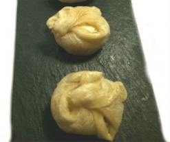 - Cierre cada hojaldre juntando las 4 esquinas sobre el Brie. Pinte ligeramente la superficie con el huevo batido.