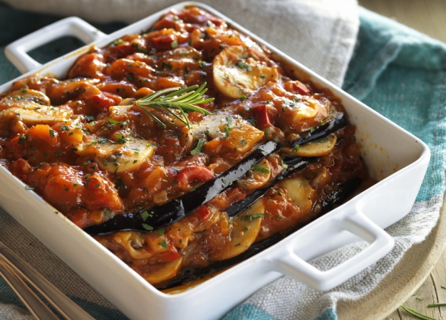 - Monte las capas de moussaka en la cubeta con un cucharón de verduras (una capa de berenjena, otra de verduras, etc.) hasta acabar con los ingredientes.