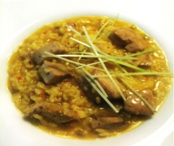 - Vierta 4 medidas de agua en la cubeta e introduzca todos los ingredientes menos el bonito. Remueva bien, cierre la tapa y programe el menú Arroz.