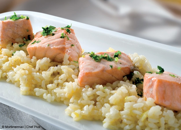 - Añada el agua y el salmón e inicie el menú Arroz con la tapa abierta. Cuando falten 7 minutos para acabar, cierre la tapa y espere a que finalice el programa.