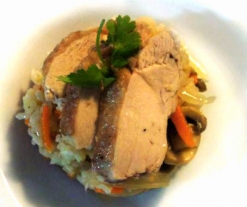 - Pique la cebolla; corte la zanahoria y el apio en bastoncitos; limpie y corte los champiñones en láminas; corte la pechuga en trozos de bocado.
