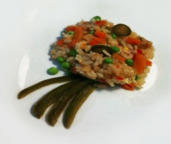 - Introdúzcalo todo en la cubeta junto con el resto de ingredientes, remueva y programe el menú Arroz.