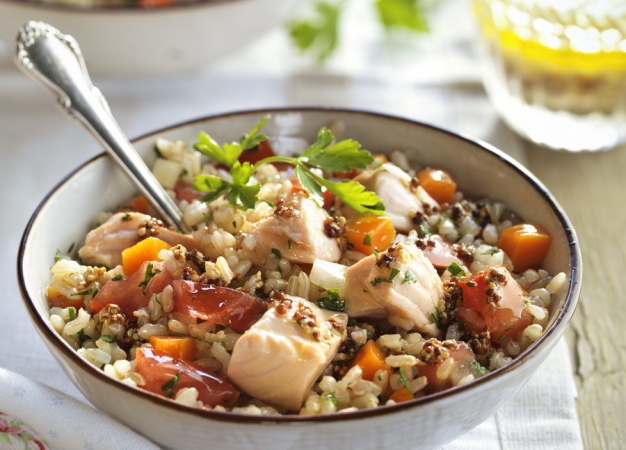 - Cuando el arroz se haya enfriado, mezcle con la zanahoria y las verduras picadas; añada el salmón por encima y aliñe al gusto con la vinagreta.
