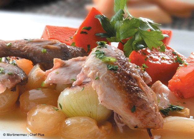 - Incorpore el resto de ingredientes, excepto las uvas, el perejil y la calabaza, y añada el laurel y los granos de pimienta. Añada en último lugar el vino, una pizca de sal y el agua.