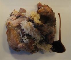 Saque el faisán y córtelo en 4 piezas. Sírvalo en los platos sobre una base de chucrut.