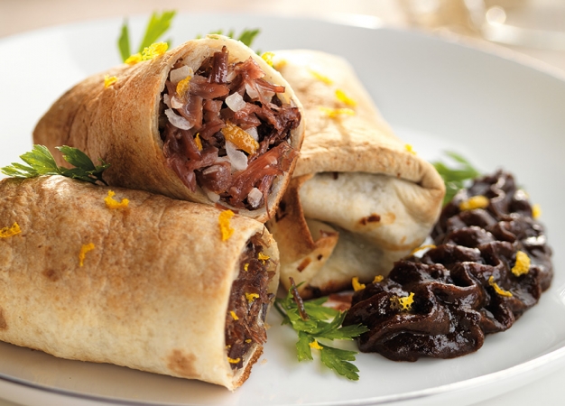 - Disponga las tortillas sobre una superficie plana y reparta la mezcla de pato especiado sobre ellas. Distribuya un poco de salsa de ciruelas sobre el pato. Cierre la tortilla formando el canelón o un paquete cerrado (puede pinchar con un palillo el canelón para que no se desmonte).