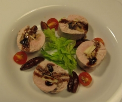 - Rellene la pechuga con las rodajas de manzana, los frutos secos troceados y las pasas escurridas; deje un borde amplio sin relleno.