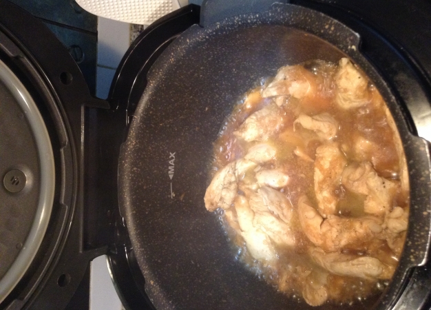 3-Meter en la cubeta el pollo,los ajos, la cebolla, el agua, la miel y la salsa de soja.