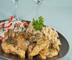 - Corte el pollo en trozos pequeños, pique el perejil, el ajo y la cebolla, lave y corte los champiñones en láminas.