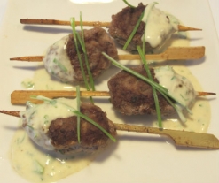 1. En un bol, mezcle la carne picada con el vino blanco, el clavo y la pimienta. 2. Moldee 36 bolas del tamaño de una nuez con la carne y ensártelas poniendo 3 en cada brocheta (salen 12 brochetas). 3. Eche en la cubeta una cucharada de aceite, coloque 4 brochetas, cierre la tapa y programe el menú Horno a 180º durante 4 minutos. Cuando acabe el programa, abrir la ChefPlus, girar las brochetas y cerrar. Esperar 2 minutos para que se doren por la otra cara. Repita la operación otras 2 veces hasta cocinar todas la brochetas. (3 tandas) 4. Mientras tanto, prepare la salsa mezclando el yogur, la mostaza, el azúcar y la menta. Salpimiente, viértalo en un recipiente y espolvoree la nuez moscada. 5. Vuelva a introducir todas las brochetas en la cubeta, cierre la tapa y programe el menú Horno a 180º durante 2 minutos 6. Sirva las brochetas acompañadas de la salsa. |