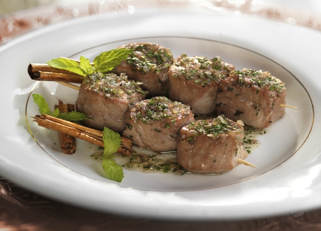 - Introduzca los trozos de solomillo en 8 brochetas cortas.