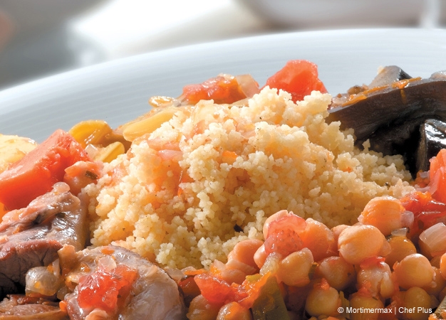 - Introduzca la carne y los garbanzos en la cubeta. Añada la cebolla, la zanahoria, las judías, el nabo, las pasas, el aceite, las especias y una pizca de sal. Vierta 2 medidas de agua, cierre la tapa y programe el menú Carnes.