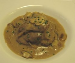 - Cuando estén, añada la cebolla, los champiñones, el vino Marsala, el agua, la pastilla de caldo desmenuzada, el zumo de limón, la mantequilla, la nata y 1 cucharada de harina. Para acabar, cierre la tapa y programe el menú Carnes.