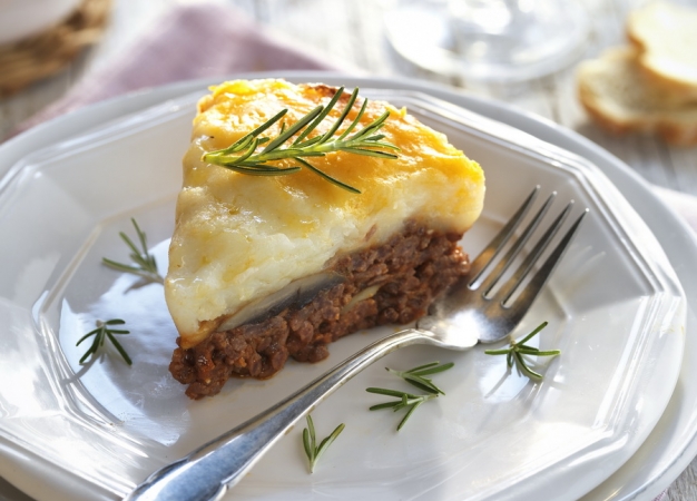 - Distribuya el puré de patatas sobre la mezcla anterior; alise para crear una capa uniforme. Programe el menú Horno 50 minutos a 162 °C.