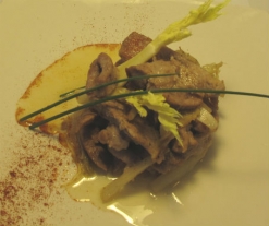 - Corte la carne en tiras, los ajos en láminas, el tallo de apio en tiras finas y el jengibre en rodajas también muy finas.