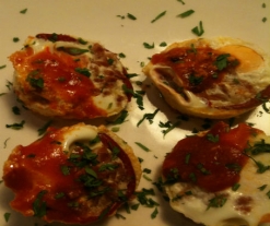 - Disponga 2 cucharadas de tomate frito en el fondo de cada flanera, casque un huevo encima y sazone con sal.