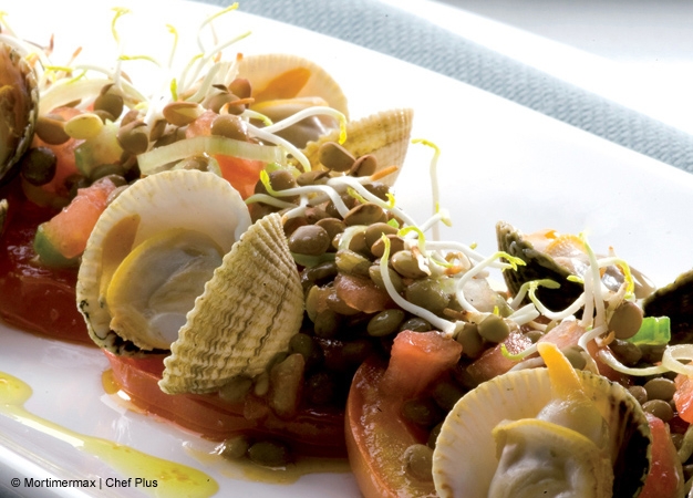 - Disponga 3 medidas de agua en la cubeta Chef PlusInduction. Programe el menú Freír/Sofreír a 180º durante 15 minutos, y cuando rompa a hervir (unos 7 minutos), incorpore la mitad de los berberechos escurridos; retírelos en cuanto se abran. Cuélelos y deseche los que estén cerrados. Repita con la otra mitad. (Si sobra tiempo de programa, cancele).Separe los berberechos de las cáscaras.Riéguelos con un chorrito de aceite de oliva.