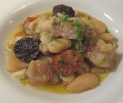 - Ponga en la cubeta las fabes, el tocino, la morcilla, el chorizo y 2 dientes de ajo rotos. Añada el agua y programe el menú Presión a 135º durante 37 minutos.