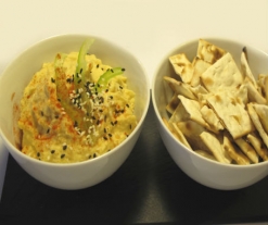 - Cuando finalice, traslade el contenido de la cubeta a un recipiente alto. Añada más o menos agua del caldo de cocción según la textura deseada.Triture, incorporando poco a poco el zumo de limón, el aceite de olivay el ajo;rectifique la sal. Espolvoree los dos tipos de sésamo para decorar.
