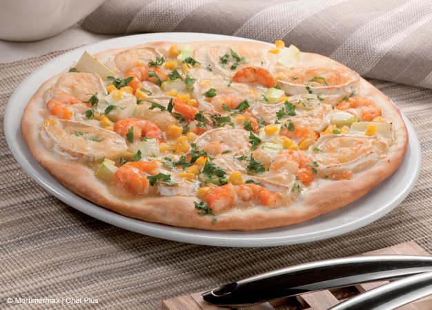 - Coloque un papel de horno en el fondo de la cubeta e introduzca una de las dos masas. Distribuya por encima la mitad de los ingredientes de la cobertura: el calabacín cortado en cubitos, el maíz, el queso de cabra en rodajas y las gambas.