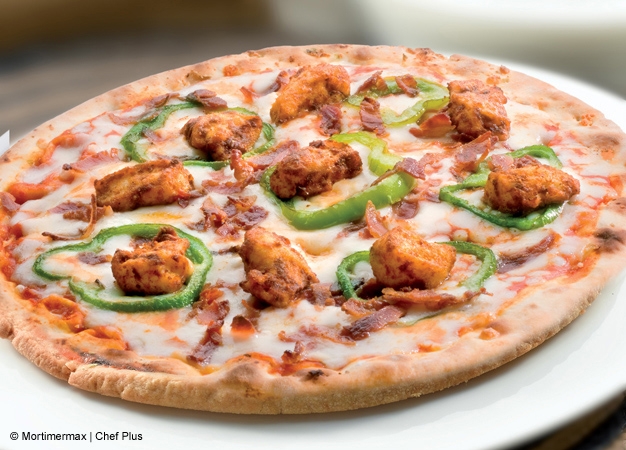- Coloque un papel de horno en el fondo de la cubeta e introduzca una de las masas. Distribuya por encima la mitad de los ingredientes de la cobertura: el pollo desmenuzado, el pimiento cortado, la mozzarella y el tomate. Programe el menú Horno 20 minutos a 180º.