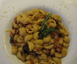 - Limpie la berenjena, córtela en tiras, sálela y déjela reposar30 minutos en un escurridor para que suelte el agua. Limpie el pimiento y córtelo también en tiras. Pele y pique la cebolla y el ajo, trocee la panceta, pique la hierbaluisa y ralle la piel del limón muy fina; reserve el zumo.