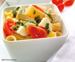 - Ponga el agua en la cubeta con un pellizco de sal y programe el menú Freír/Sofreír a 180º durante 20 minutos; cuando hierva ponga la pasta (rigatoni, macarrones, fusilli tricolor, tiburones,etc.) y cocine según las instrucciones del fabricante. Escurra, enfríe y reserve.