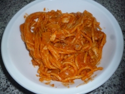 - Engrasamos la pasta con el aceite. Pelamos y cortamos en trozos muy pequeños la cebolla (si se prefiere, se puede rallar). Ponemos todos los ingredientes en la cubeta, los cubrimos con agua y salpimentamos al gusto.