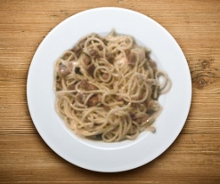 - Engrasamos la pasta con el aceite y la ponemos en la cubeta de la Chef Plus Induction. Añadimos los taquitos de jamón, lo cubrimos con agua y removemos y programamos el menú pasta.