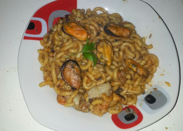 - -Introducimos la mitad de las gambas y mejillones y removemos todo durante otros 5 minutos.