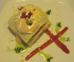 - Corte las placas por la mitad y monte lasañas individuales o monte una grande en una bandeja poniendo capas de relleno y de pasta sucesivamente. Acabe con la salsa rosa y decore a su gusto con huevo rallado, aceitunas, pimiento, etc.