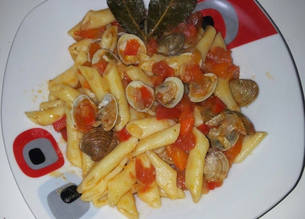 - Introducimos la pasta que teníamos reservada y cocida, removemos muy bien para mezclar los sabores y programamos el menú a fuego lento para que terminen de abrirse las chirlas y el pimiento no quede duro.