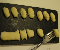 - Añada al bol la harina y el queso y amase bien. En una mesa espolvoree harina y haga churros de 1 centímetro de diámetro con la masa. Corte porciones de 2 centímetros de longitud y con la mano y un tenedor deles la forma adecuada.