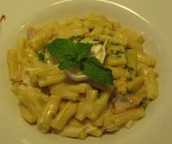 - Al acabar, mezcle el salmón con la pasta y sirva enseguida con una rodaja de queso sobre cada ración.