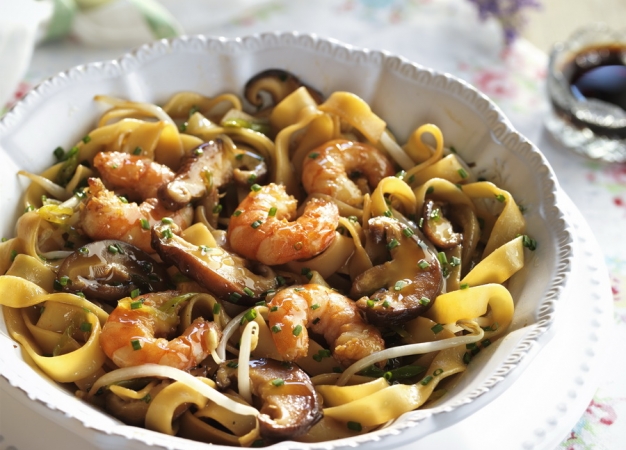 - Programe el menú Sofreír/Freír 15 minutos a 168 °C y ponga en marcha con la tapa abierta; eche el aceite y la cebolleta, remueva a menudo. Cuando falten 10 minutos, introduzca las setas y los ajetes, espere un par de minutos y añada las colas de gamba con la salsa de soja. Cocine hasta que falten minutos para acabar.