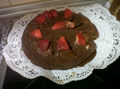 - Desamoldamos cuando este frío y adornamos con cobertura de chocolate y las fresas restantes.
