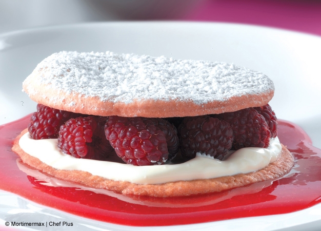 - Extienda un poco de esta salsa en cada plato, coloque un disco encima y cúbralo con la crema de relleno. Decore con unas frambuesas y cubra con otro disco. Espolvoree azúcar glas justo antes de servir.