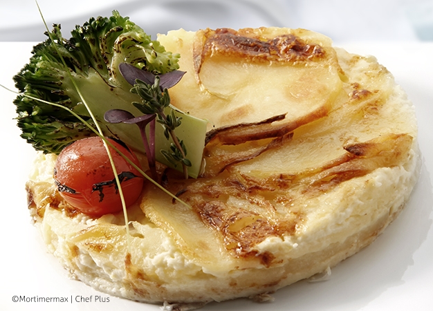 - Pele el diente de ajo y frótelo por las paredes y el fondo del molde.Salpimiente las patatas y la cebolla, y dispóngalas por capas en el molde. Luego cubra las patatas con la nata y, si lo desea, puede añadir un poco de queso Parmesano. Introduzca el molde en la cubeta.
