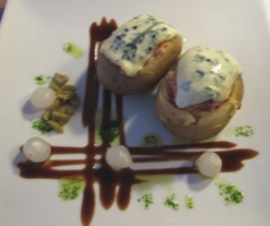 - En un bol, mezcle los quesos variados (reserve el Roquefort), el jamón, la pulpa de la patata y los pimientos asados. Rellene las patatas con esta mezcla.