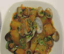 - Pele y corte las patatas en trozos grandes; pique la cebolla y los ajos. Limpie las almejas.