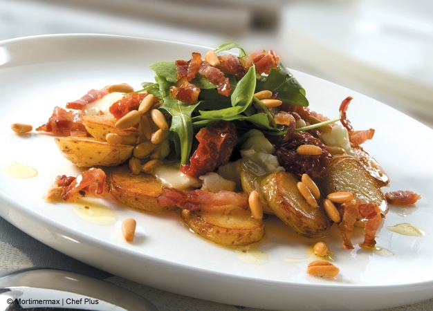 - Al finalizar, añada la mozzarella cortada en daditos o rallada, y remueva con cuidado para no romper las patatas. Sirva con la rúcula por encima.