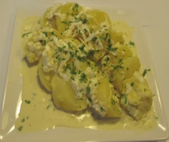 - Disponga esta salsa encima de las patatas cortadas y adorne con el huevo duro y el perejil.