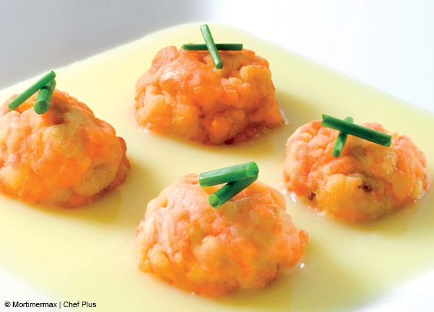 - Disponga las albóndigas sobre la bandeja de vapor y colóquela sobre los ingredientes de la salsa. Cierre la tapa y programe el menú Pescados. Antes de servir, triture la salsa.