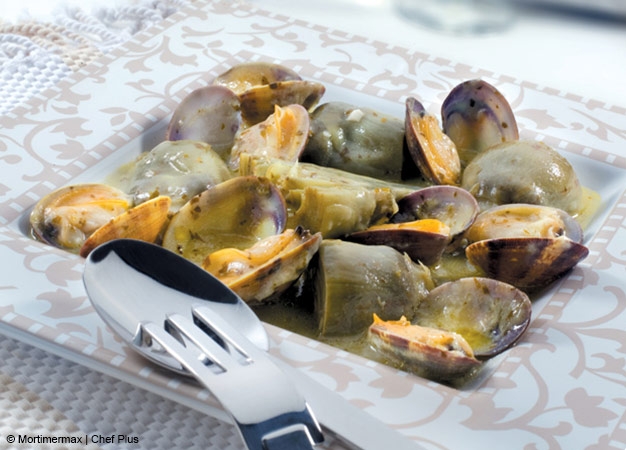 - Lave las almejas con abundante agua. Programe el menú Freír/Sofreír a 180º durante 10 minutos y vierta las 4 medidas de agua en la cubeta. En cuanto rompa a hervir, incorpore las almejas y retírelas cuando se abran. Cuélelas, deseche las que no se hayan abierto y reserve el fumet en un bol.